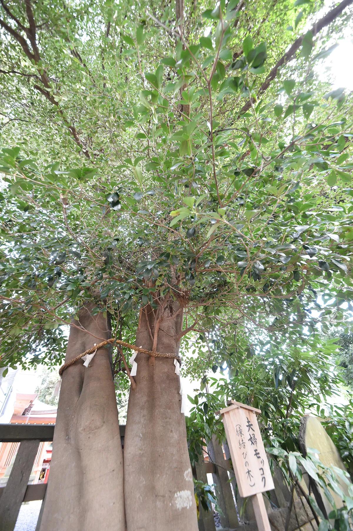 拝殿に向かう石段の右側にあるのが、二株の根元が一つに固く結ばれた御神木「夫婦木斛