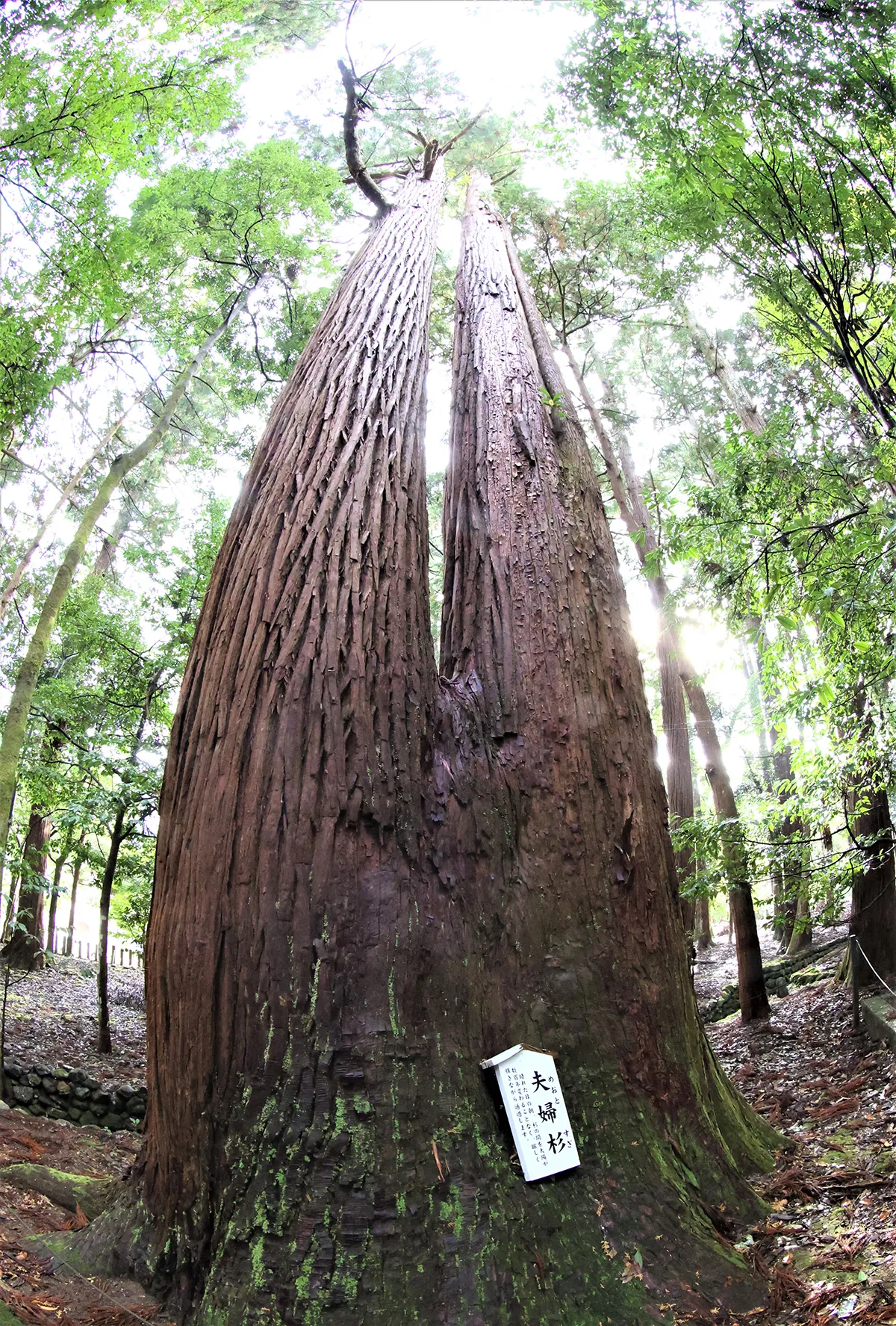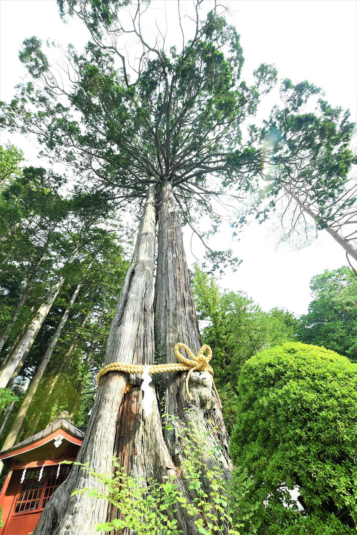樹高33mの冨士夫婦檜は、根を張った1本が地上3m付近で2本に分かれ、12m付近で再び寄り添う姿から、別れてもまた再び逢える「縁結びの神様」として知られています。