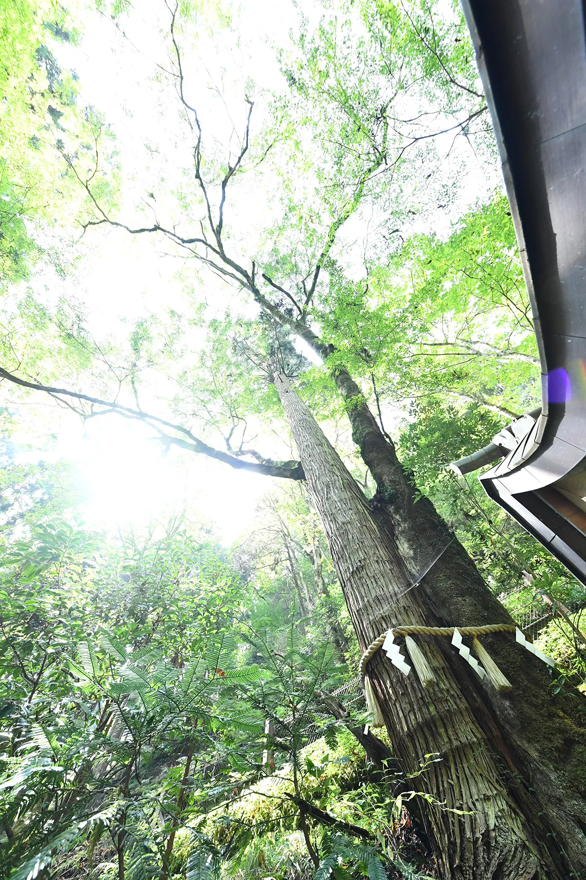 樹齢数百年の杉や檜が両脇を覆う参道でひときわ目を引くのが、拝殿両翼にある横綱のような蝶結びの注連縄が巻かれた2本の御神木です。